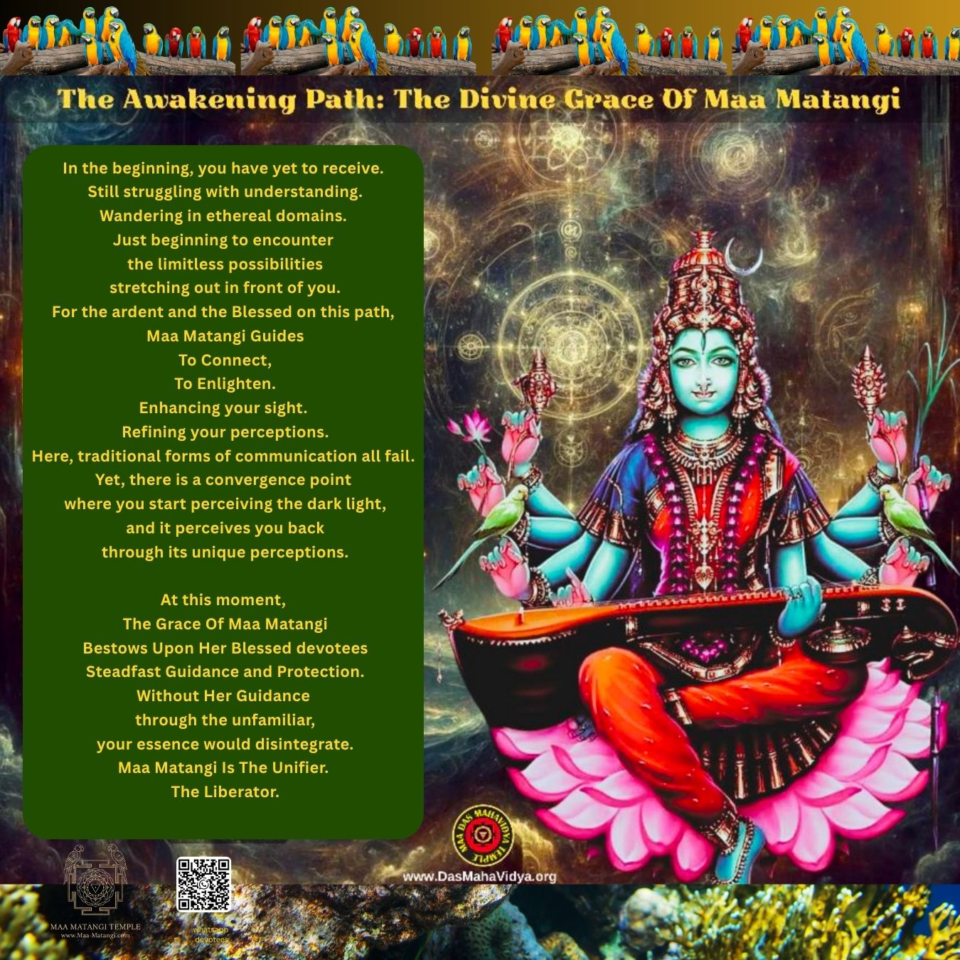 I meditate On Maa Matangi, Divine Form Of The Divine Mother. Sitting On A Throne Of Jewels, She Is Listening To The Sweet Sounds Of Parrots. The Colour Of Her Divine Body Is Dark. She Has One Foot On A Lotus, And She Wears A Half-Moon On Her Divine Forehead. Wearing A Garland Of Flower Buds, She Touches The Strings Of A Vina. Her Divine Form Is Wrapped In Red Garment. In Her Hand Is A Shell Bowl. Her Divine Face Is Luminous And Her Fragrance Is Divine, And A Red Dot Shines On Her Divine Forehead.
