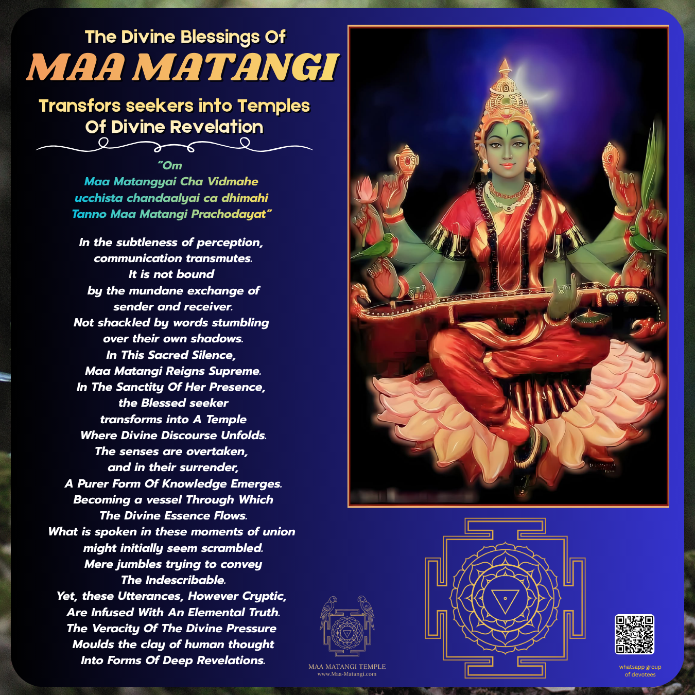 Maa Matangi Is worshipped with the offering of uchchhishta, or leftover food, instead of offering pure food, Guiding the sincere devotees Towards freedom from ordinary ideas of right and wrong, pure and impure. Maa Matangi Teaches That impurity is not caused by the failure to be ritually pure but by the limitation of wisdom and consciousness in devotees. Maa Matangi Liberates consciousness from the bondages of false notions and Blesses deserving devotees To Enable them to teach and guide others on the path of knowledge.