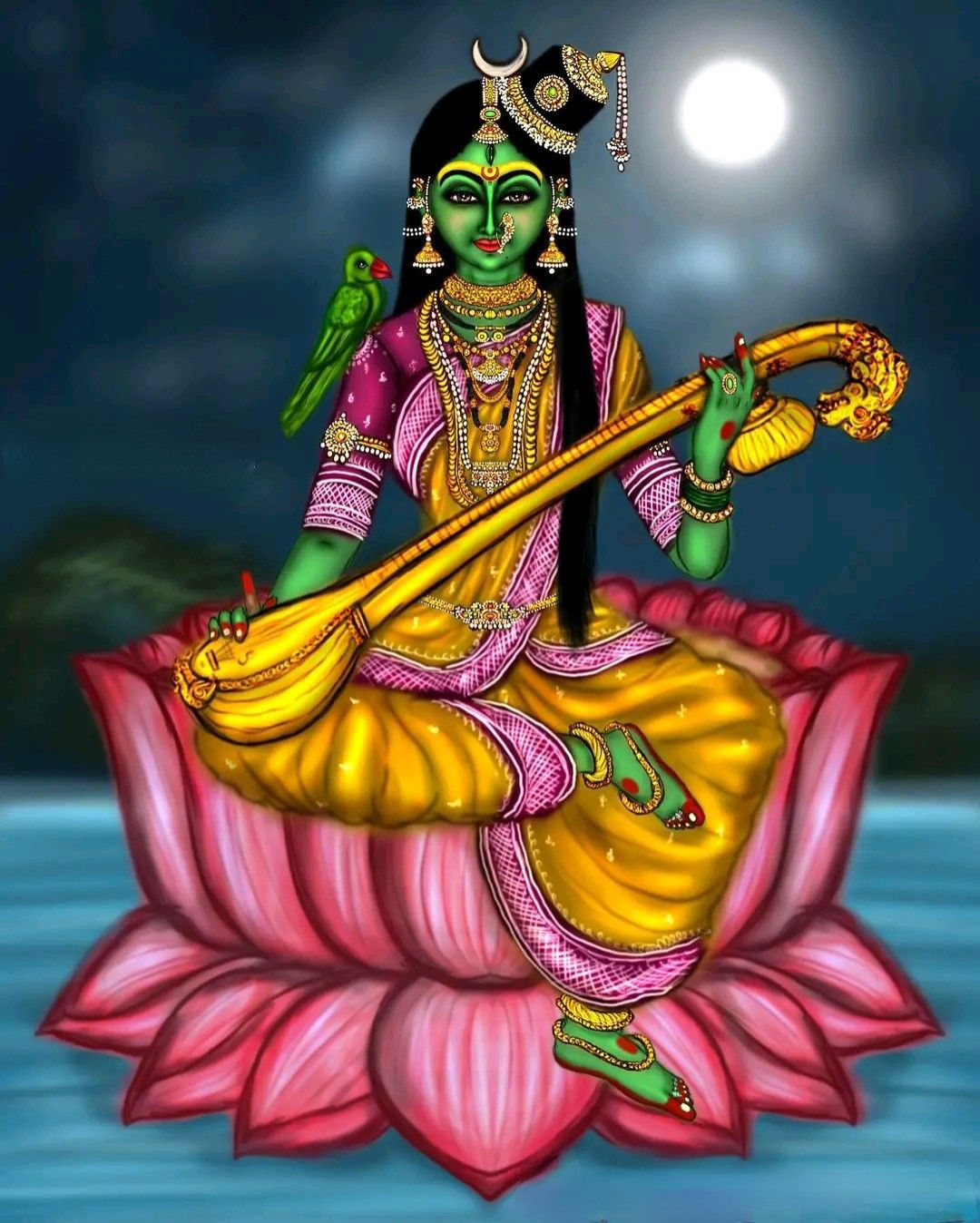 I meditate On Maa Matangi, Divine Form Of The Divine Mother. Sitting On A Throne of jewels, She Is Listening To the sweet sounds of parrots. The Colour Of Her Divine Body Is Dark. She Has One Foot on a lotus, And She Wears A Half-Moon On Her Divine Forehead. Wearing A Garland Of Flower Buds, She Touches The Strings Of A Vina. Her Divine Form Is Wrapped In Red Garment. In Her Hand Is A Shell Bowl. Her Divine Face Is Luminous And Her Fragrance Is Divine, And A Red Dot Shines On Her Divine Forehead.